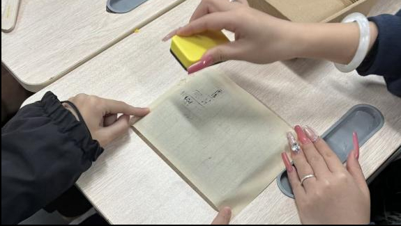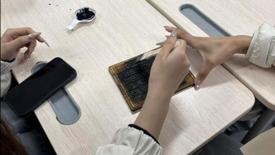 创作环节中,团员们热情高涨,认真依照步骤耐心上墨、对齐、按压,在反复实践中掌握力度与节奏。大家精心挑选字句、灵活排版,将古典意蕴与青春创意融入作品。团支书穿梭于各组之间,耐心答疑、细致指导,协助团员完成创作,现场氛围热烈融洽。