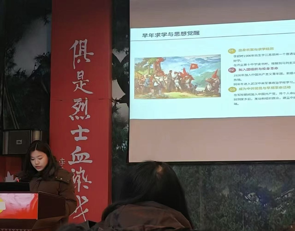 图为实践团成员讲解李超时同志早年求学经历 卢小雁 供图
