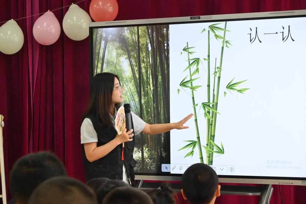 随着课程渐入佳境,实践队员们借助精心制作的 PPT,系统讲解了竹编文化的起源脉络、发展历程以及蕴含的匠心智慧。在队员们循循善诱的启发下,同学们纷纷举起小手积极回答问题,眼神中闪烁着对新知识的好奇与渴望,在一来一往的互动中,大家对非遗竹编的认知愈发深刻,也为后续的实践环节埋下了浓厚的兴趣伏笔。