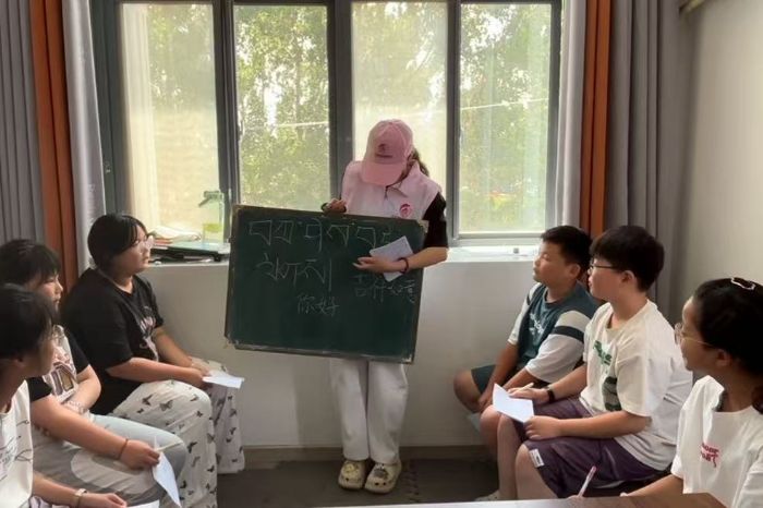 实践过程中,志愿者通过图片展示的方式,引导学生认识藏族、壮族等少数民族,细致观察各民族服饰的色彩、花纹与样式特征,如藏族服饰的华丽装饰与壮族服饰的精美刺绣。在民族语言教学环节,志愿者组织开展藏语简单口语学习,带领学生掌握“你好”“谢谢”“对不起”等基本问候语的发音,并示范“你好”的藏文写法,指导学生跟读和摹写。