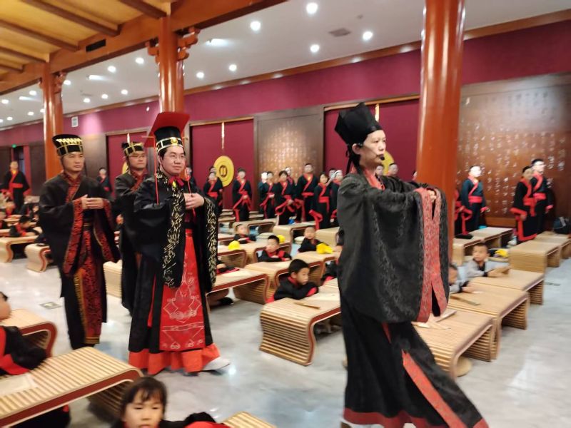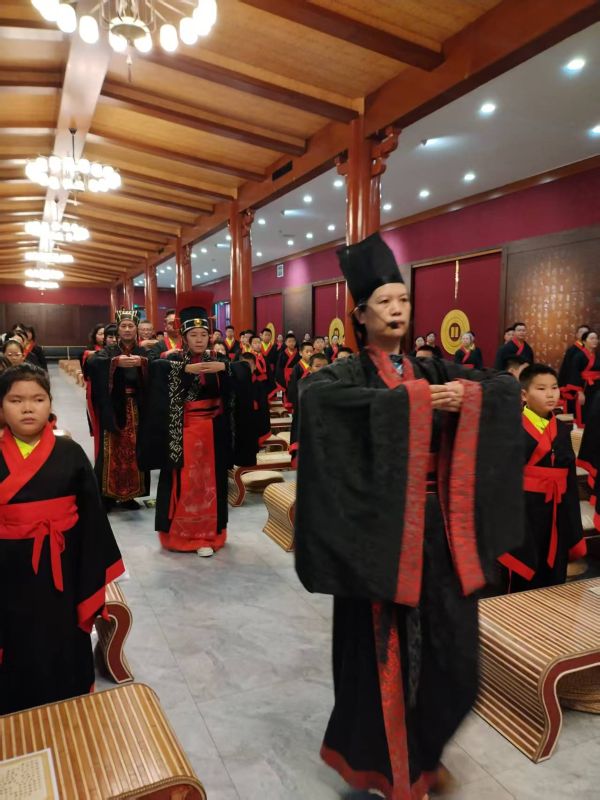 实践团队首日抵达书香曲阜孔子学堂,该学堂以“承孔圣之道,弘家邦之德”为宗旨,建筑陈设融贯传统礼制与经典文化,为家风调研营造出浓厚的文化氛围。正值学堂举行传统拜师仪式,实践团队全程参与并协助执礼。从“正衣冠”到“行叩拜”,再到“献束脩”,团队成员亲身实践《礼记》所言“礼仪之始,在于正容体、齐颜色、顺辞令”的传统仪轨。众多礼仪中,尤其以家庭为单位的参礼方式,使“尊师重道”通过父母示范、子女效仿,实现了家庭伦理与文化传承的自然融合。