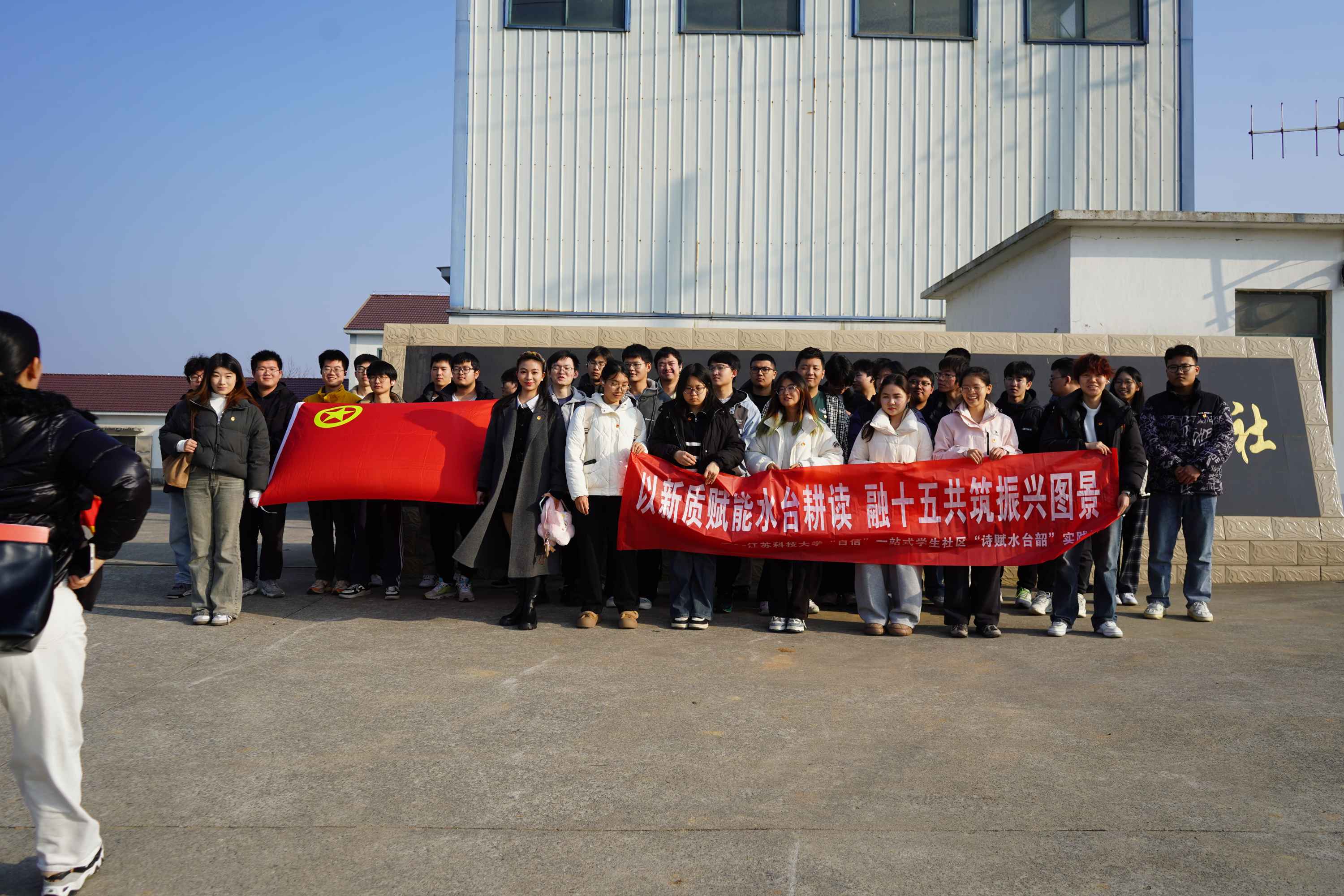 2026年01月19日,江苏科技大学“自信”一站式学生社区2422103023团支部“诗赋水台韶”实践团,奔赴镇江市丹徒区高资街道水台村,开展“诗韵田园・耕读水台”乡村文化传承与农业发展教育实践活动。团队先后走访水青水稻专业合作社、天成农业科技有限公司凤头鸭养殖基地及水台村闻捷诗歌馆,在产业一线与文化场馆间,探寻乡村振兴的丹徒路径,在文化浸润与田间实践中感受乡村振兴的强劲脉动,深化对“三农”的认知,锤炼实践本领。