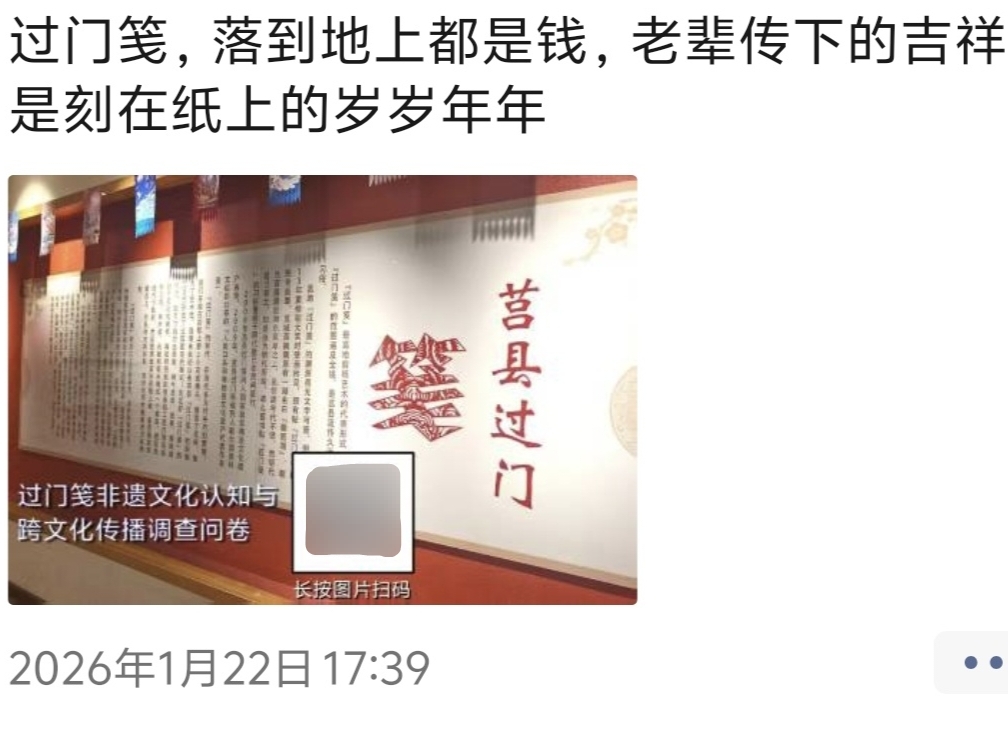 2026年1月15日,曲阜师范大学翻译学院“河润千年,笺承一脉”实践队,围绕过门笺相关内容发布了调查问卷。问卷旨在了解大众对过门笺及黄河流域非遗文化传播的认知与看法,及其在跨文化翻译与传播中的看法。