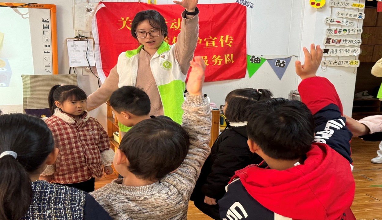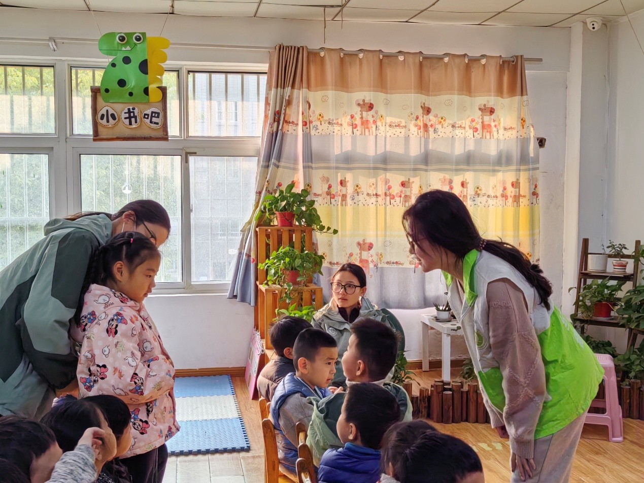 图为志愿者提问幼儿园孩子们积极举手回答。乔晨阳 供图