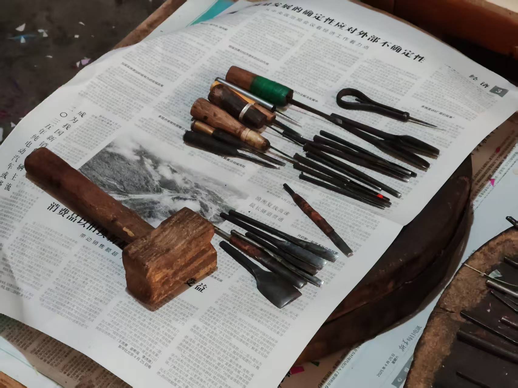 初入史龙江老师家中,最震撼的是那满满一桌的刻刀。史老师说,一套完整的过门笺工具要三十余把,从宽刃的“铲刀”到细如针尖的“线刀”,每一把都对应着不同纹样的凿刻需求。我原以为过门笺是用剪刀剪出来的,却不知它是用木槌敲击刻刀,在数层叠压的彩纸上凿刻而成。当我试着握起刻刀,木槌落下的瞬间,掌心传来的震颤让我突然明白:这不是冰冷的机械劳作,而是手与刀的对话,是力道与分寸的精准平衡。史老师站在一旁,用布满老茧的手扶住我的刀身:“你的手腕和身体别动,让刀在你手里转动。”看着他沉稳的动作,我忽然明白,所谓“匠人”,就是把千钧力气藏在方寸之间,让每一刀都带着恰到好处的力度。