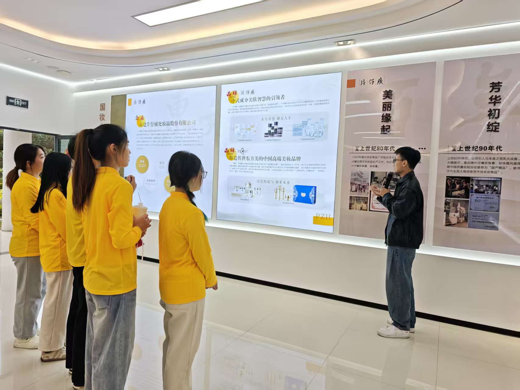 最后,实践队来到片仔癀化妆品展厅,展厅内雪肌润白、修护维稳等系列产品琳琅满目,全方位展现出品牌从深耕国药领域到成长为“传世东方美的中国高端美妆品牌”的进阶之路。同学们亲身使用产品、体验功效,详细了解品牌通过打造年轻化吉祥物“癀小御”、推出主题盲盒文创等形式积极贴近年轻消费者的创新举措,这让同学们对传统文化的现代表达有了全新思考。