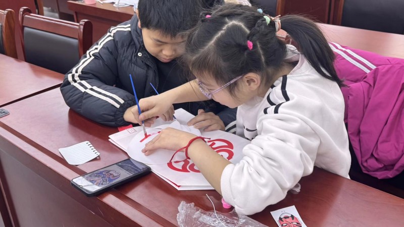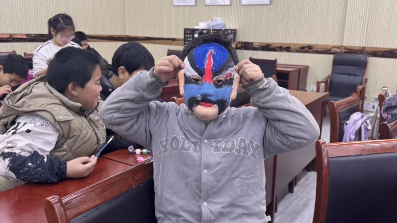 祝小傲穿梭在孩子们之间,随时为遇到难题的孩子答疑解惑、提供指导,手把手教孩子们调试颜料、勾勒流畅线条。看着孩子们从最初的手足无措,到慢慢摸索出技巧,一点点为空白面具赋予鲜活的色彩与独特的灵魂,脸上漾起满满的成就感,祝小傲的心中也满是暖意。创作过程中,孩子们还会主动交流想法,分享绘画的小技巧,彼此启发、互相学习,小小的教室中,既有着创作的专注,更有着同伴间的美好互动。祝小傲也在这个过程中深深体会到教学相长的真谛,孩子们的奇思妙想,也让他对京剧脸谱的多元表达有了新的思考与感悟。