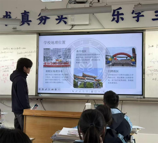 回访母校展风采,精准宣讲引航向 在“荣校”实践环节,实践队员主动联系各自高中母校,面向高三毕业班举办多场大学招生宣讲会。宣讲会上,实践队员利用精心制作的图文资料与短视频,全面介绍了曲阜师范大学的办学历史、学科优势、师资力量、校园文化以及近年来的招生录取情况。宣讲过程互动频繁,实践队员就学弟学妹们关心的专业选择、备考策略、大学生活规划等问题进行了耐心细致的解答,并建立了线上长效咨询渠道,为优质生源报考搭建了桥梁。
