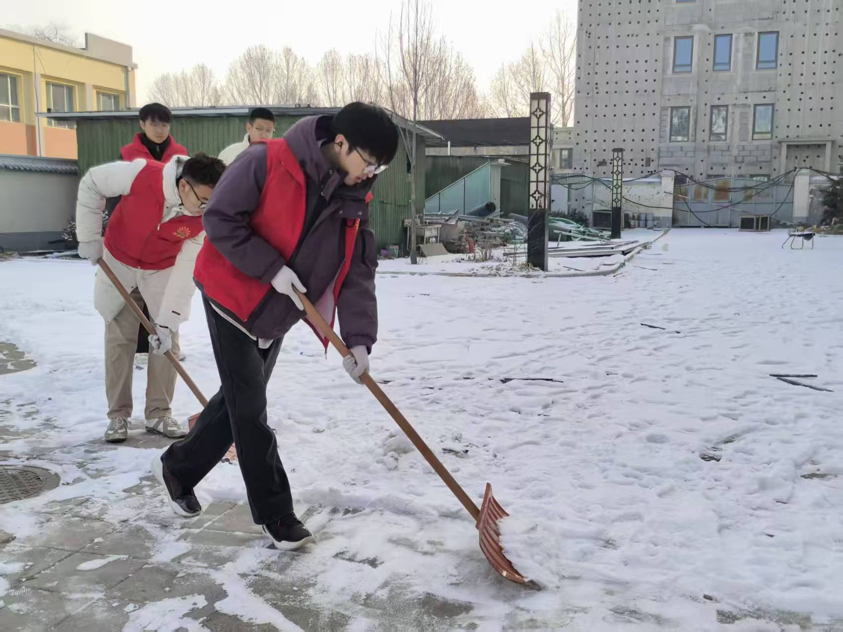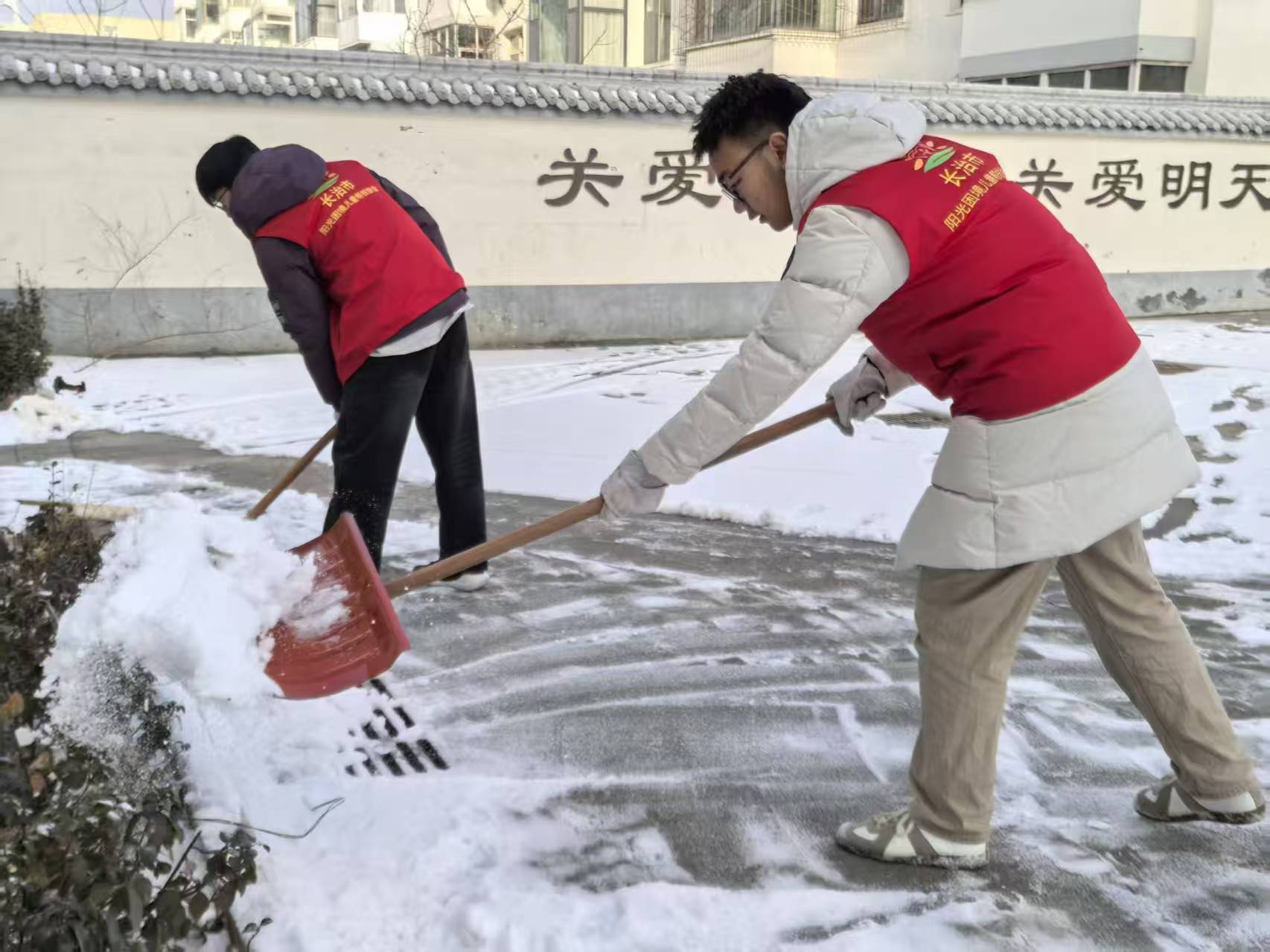 活动一开始,志愿者们便迅速投入战斗,根据社区实际需求分成三组,有条不紊地开展服务。扫雪组的志愿者们率先奔赴社区主干道、单元楼门口及台阶处,面对夜间堆积的薄雪和凝结的冰碴,大家手持铁锹奋力铲击,用扫帚仔细清扫,从主干道到楼栋门口,不放过任何一个容易滑倒的角落。有人负责敲碎硬冰,有人负责归集积雪,有人则将清理出的道路边缘压实,确保居民出行安全,忙碌的身影在白雪皑皑中来回穿梭,红马甲与白雪相映,成为冬日里一道亮眼的风景线。
