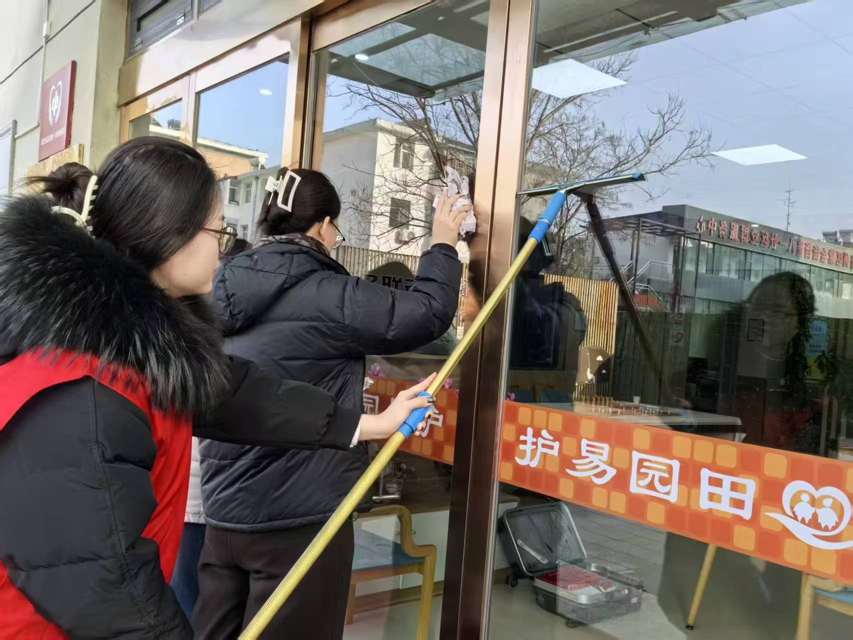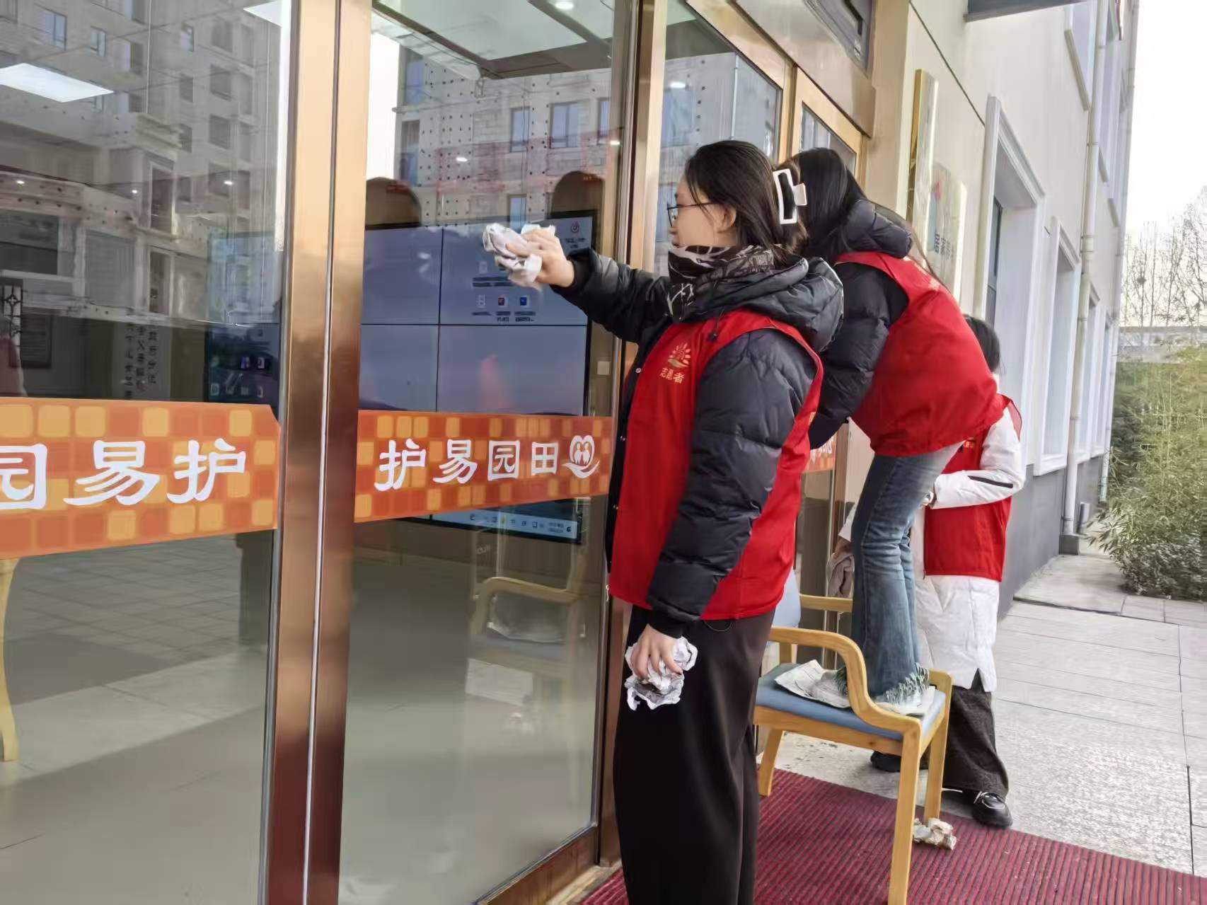 与此同时,擦窗组的志愿者们拎着社区提供的水桶和玻璃刮,聚焦社区服务中心的公共区域。他们先用水浸湿抹布,仔细擦拭落地玻璃、公告栏玻璃上的灰尘与污渍,再用玻璃刮自上而下刮净水渍,最后用干布将边角残留的水珠擦干。志愿者们分工配合,从玻璃表面到窗框缝隙,每一处都擦拭得一丝不苟,让原本蒙尘的玻璃变得洁净透亮,让社区服务中心的环境更显整洁明亮。