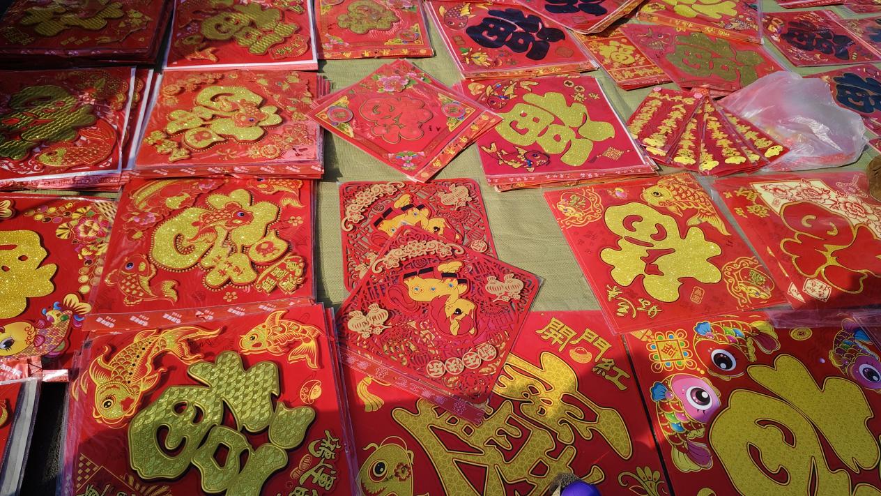 腊月廿六,正值年关,滨州阳信的黄河大集上,满目中国红在冬日暖阳的映照下格外鲜明。春联、福字、中国结等节庆饰品琳琅满目,而最具鲁北地域特色的,当属那一张张迎风摇曳的过门笺。它们如红色风铃般悬挂于摊位之间,无声地奏响了春节的序曲。