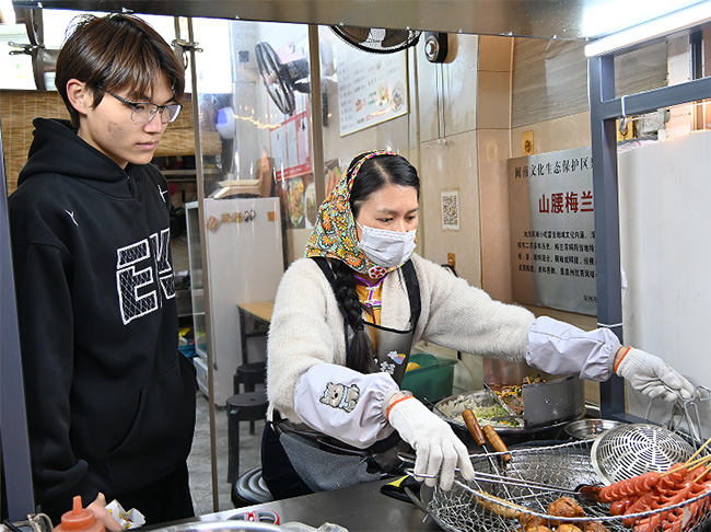 二、海丝潮声里,古厝风味的古今交响 海丝之路曾载着香料、食材与风味穿越重洋,闽南烟火气正是这千年商路的鲜活遗存。实践队深知,读懂海丝不仅要探古迹、溯文脉,更要于市井风味中捕捉文化交融的印记,于是深入梧林传统村落与泉州西街。古厝改造的美食空间里,面线糊裹着虾蛏的海味鲜醇,是海洋馈赠的直白表达;绿豆饼藏着蟳埔女婚嫁的甜意,肉燕承载节庆团圆的温情,每一味都沉淀着海丝贸易带来的食材交融与民俗传承。老字号饼铺里,师傅揉搓面团的力道藏着世代坚守;金鱼巷浮粿摊前,我们亲手翻面控油,在滋滋油锅声中读懂市井美食的传承智慧。而文创包装、新潮搭配让古早味焕发新生,恰如千年海丝始终包容共生,让传统风味在当代持续传递文化温度。