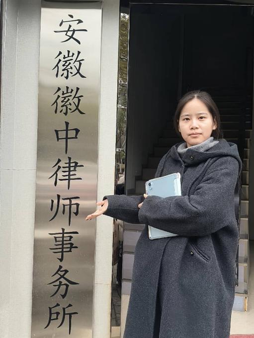 2026年2月10日,实践队员唐娜在安徽徽中律师事务所门口留影。通讯员唐娜摄。