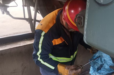 栾先生进行机车车底检查维修。/摄:栾韵华
