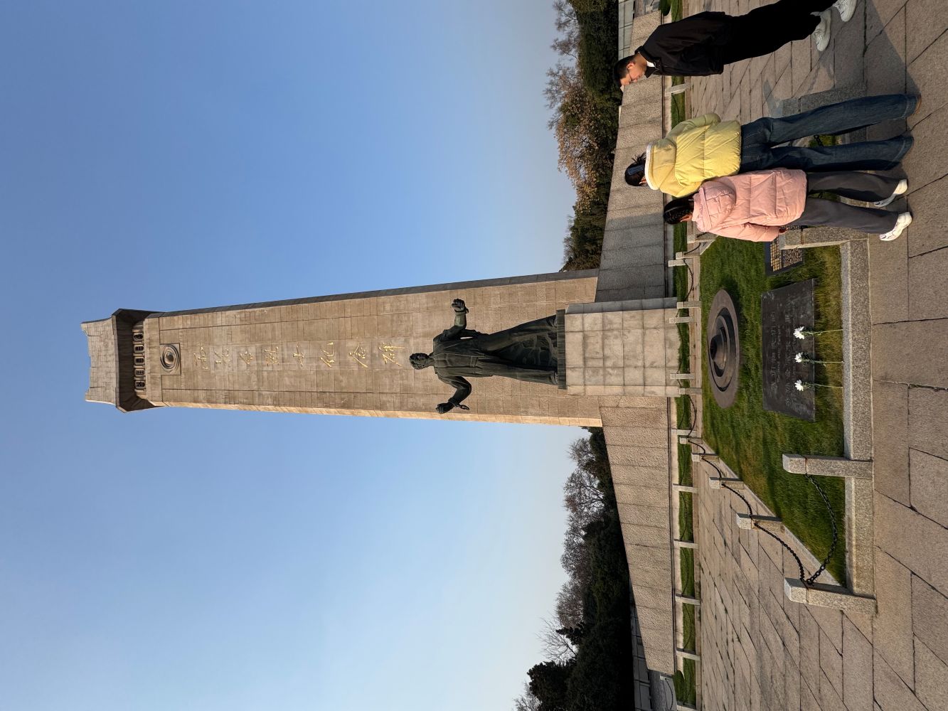雨花台的热土忠魂,激荡着穿越时空的信仰力量。实践团第二站走进雨花台烈士陵园,园区内庄严肃穆,42.3 米高的烈士纪念碑巍然矗立,“雨花台烈士纪念碑” 八个大字熠熠生辉,成为南京解放的永恒纪念。团队成员怀着崇敬的心情敬献鲜花,默哀追思,缅怀为民族解放事业牺牲的革命先烈。在烈士纪念馆,“信仰的力量” 主题展览通过详实的史料、珍贵的文物、生动的场景,还原了邓中夏、恽代英、罗登贤等英烈的生平事迹。斑驳的铁镣、磨损的衣物、字字泣血的家书,让大家看到了英烈们面对酷刑坚贞不屈、为信仰慷慨赴死的铮铮铁骨;他们中有的正值青春年华,有的舍弃优渥生活,却始终坚守 “为共产主义事业奋斗终身” 的初心,让团队成员深受震撼。漫步烈士就义群雕与北殉难处,每一寸土地都浸染着英烈的热血,大家边走边看、边听边记,认真收集英烈故事,感受雨花英烈精神的深刻内涵。