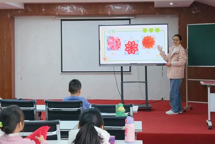 在趣味剪纸课程中,我们带领孩子们运用红色彩纸创作传统团花。面对复杂步骤,我们走下讲台一对一、手把手教学,耐心拆解折叠、裁剪等关键环节,确保每位孩子都能理解掌握。