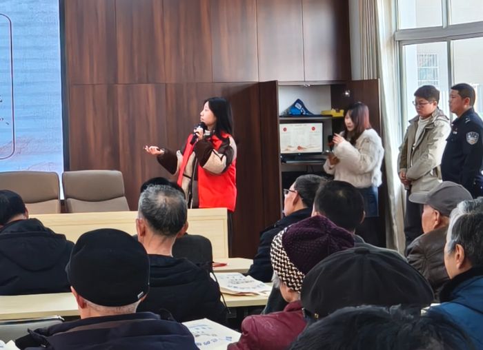 2月14日下午,薛潞瑶转赴地理位置更为偏远的丰乐街道光芒村。在村委会会议室,约十五位村内老人参与了活动。相较于城市社区,农村老年居民获取用药知识的渠道更为有限,家中存放过期药品、凭经验用药的现象较为常见。实践成员调整了讲解侧重点,着重强调了抗生素的合理使用、止痛药的依赖风险,以及中成药与西药同服可能产生的相互作用。