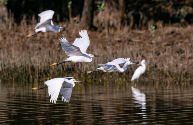在湿地观鸟台,团队通过望远镜与摄像机,专注追踪白鹭的踪迹。白鹭通体雪白的羽毛在暖阳下熠熠生辉,它们时而在芦苇丛上停歇,时而振翅盘旋划出优美弧线。队员们通过对比不同区域的观察数据发现:白鹭的活跃度与芦苇覆盖率、水质清澈度呈正相关。这一发现直观印证了“物种生存状态是生态环境的晴雨表”这一科学结论。作为国家二级保护动物,白鹭不仅为湿地增添了生机,更是湿地生态系统的“指示物种”。