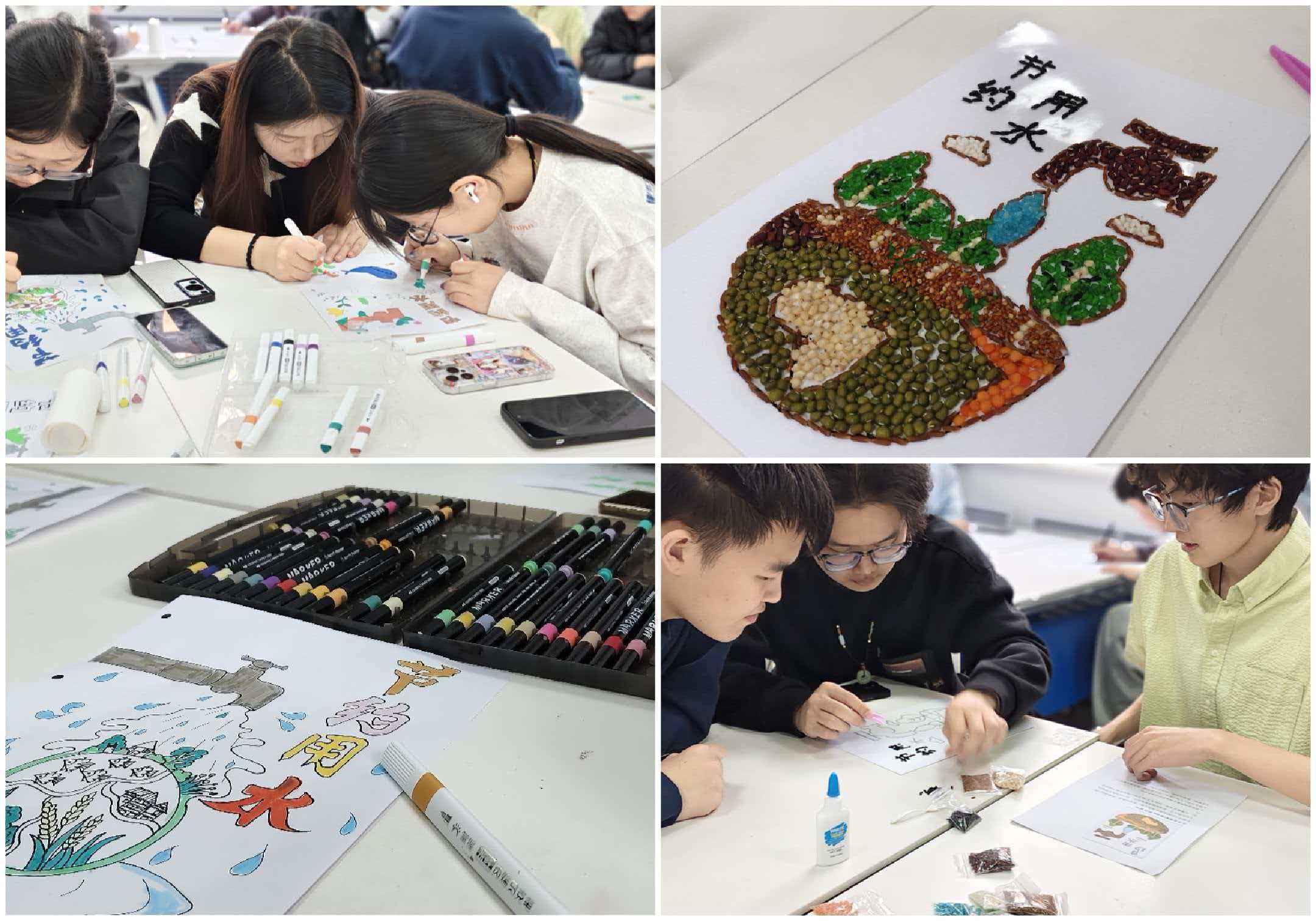 系列活动二:“妙手生花·绿意承医”文创制作活动 3月21日下午2点,志愿者们在教学楼103教室开展节水主题文创制作活动。志愿者们合理分工、协同创作,通过绘制创意节水宣传标语、拼贴节水主题五谷画、制作简易节水模型等多种形式,将抽象的节水知识与生动的艺术创作相结合,用丰富的形式和精巧的手艺,打造出一批兼具科普性与观赏性的节水文创作品,让节水护水的理念以更鲜活、更直观的形式呈现。