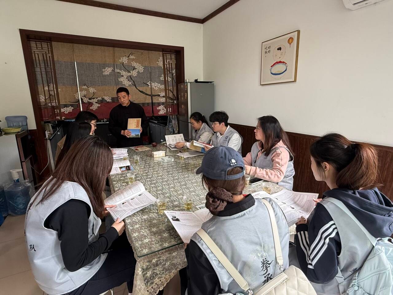 步入武院,古朴厚重的习武氛围扑面而来。团队成员围坐一堂,认真聆听张鹏军老师讲述与李派拳法相伴的习武、传武故事。他结合自身经历,娓娓道来李派拳法的历史渊源与传承脉络,细致拆解这门传统拳法的独特技艺体系与文化内涵,一字一句间,满是对传统武术的赤诚与坚守,让我们真切感受到非遗武术跨越时光、一脉相承的文化重量。