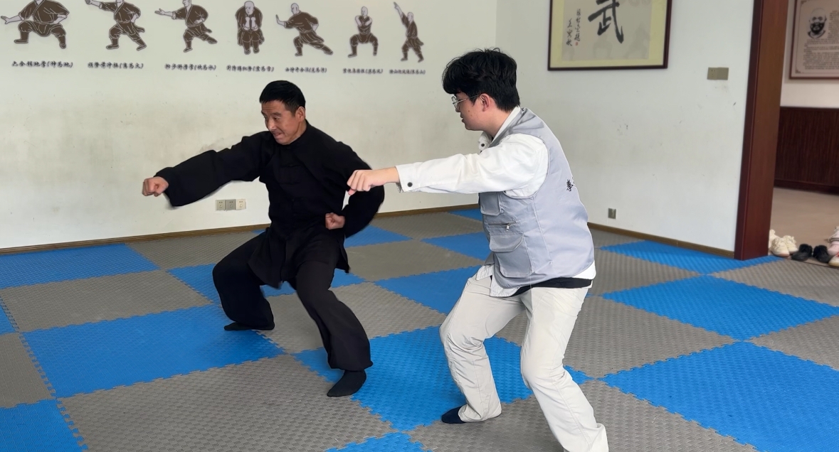 随后,团队成员现场观摩李氏太极拳的精彩展演。行云流水、刚柔并济的招式,动静相宜、流转自如的姿态,尽显传统武术的独特风骨与魅力。在张鹏军老师的耐心指导下,大家跟随练习基础拳法招式,亲身感受传统武术的招式要领与气韵节奏,在沉浸式体验与真切体悟中,触摸到书本之外传统武术独有的质感与精神内涵,收获了深刻的文化感悟。