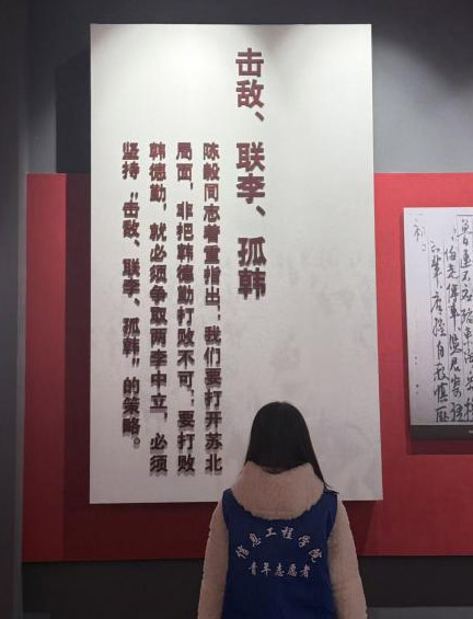 图2(图为志愿者跟随讲解员了解八路军南下、新四军北上的艰苦征程)