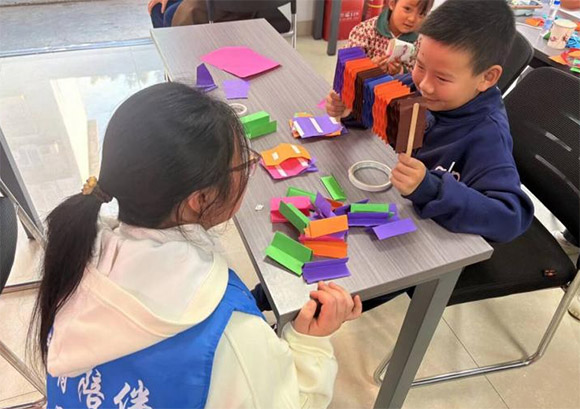 活动现场,一名小男孩的转变格外引人注目。起初,他因步骤繁琐频频出错,急躁地将材料搁置一旁。志愿队潘怡玲同学见状,便俯身坐下并询问小男孩的情况。在得知小男孩是因为认为步骤繁琐,认为自己很难独立完成而感到急躁时,她耐心地讲述非遗故事转移他的注意力,同时引导他沉下心来,在聊天中手把手带着他完成折叠、穿插等关键工序。渐渐地,男孩的眼神从烦躁转为专注,指尖的动作也愈发娴熟。当一朵色彩斑斓的翻花在他手中成型时,他兴奋地举起作品,向身边的小伙伴展示这份属于自己的成就感,脸上洋溢出自豪的微笑。