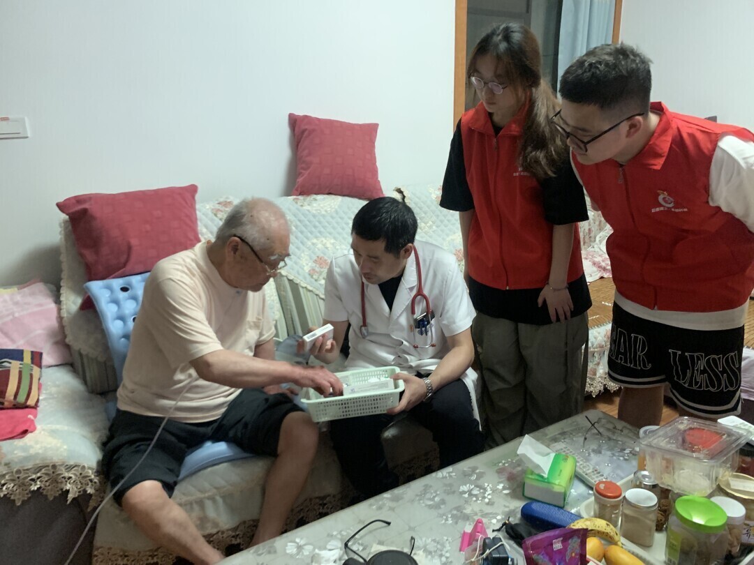 图为实践队成员邀请太和专家协同前往小区居民住户进行义诊,太和专家正在为老人检查药品,提供健康意见。