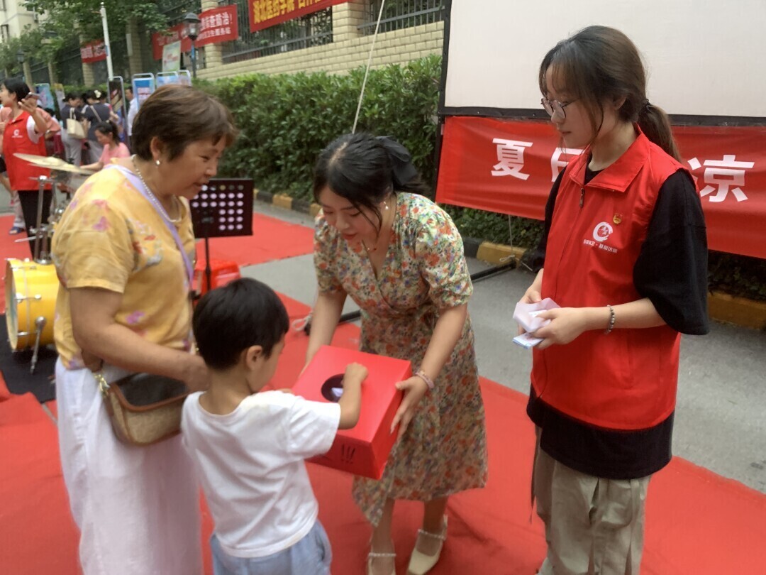 图为实践队成员正在帮助参加“健康夜市”的居民兑换奖品。
