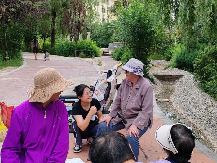 (图为成员周慧在采访社区居民 通讯员雷雪摄)
