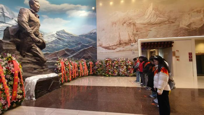 在孔繁森同志的雕像前,队员们自发列队垂首、静立默哀。雕像旁簇拥的鲜花裹着鲜红绶带,背后的高原壁画壮阔辽远 —— 肃穆的空气里,没人多说一句话,却把对 “时代楷模” 的追思与敬仰,都藏在了深深的鞠躬里。