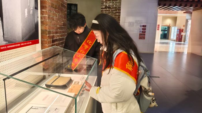 一位队员俯身凑近展柜,目光先掠过里面的旧物,又顺着展板文字慢慢移动。她的眼神里满是认真,仿佛跟着展陈的脉络,一步步走进孔繁森扎根高原、把百姓当亲人的滚烫岁月里。
