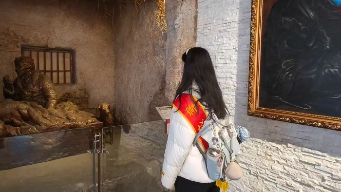 参观过程中,队员们还驻足在复原的藏区土坯房场景前。昏暗的灯光下,一尊孔繁森与牧民促膝交谈的铜像栩栩如生,旁边的土炕、木桌、铜壶等物件还原了当年的生活场景。队员们站在场景前,仿佛穿越时空,亲眼见证孔繁森与藏族群众同吃同住、亲如一家的动人画面。