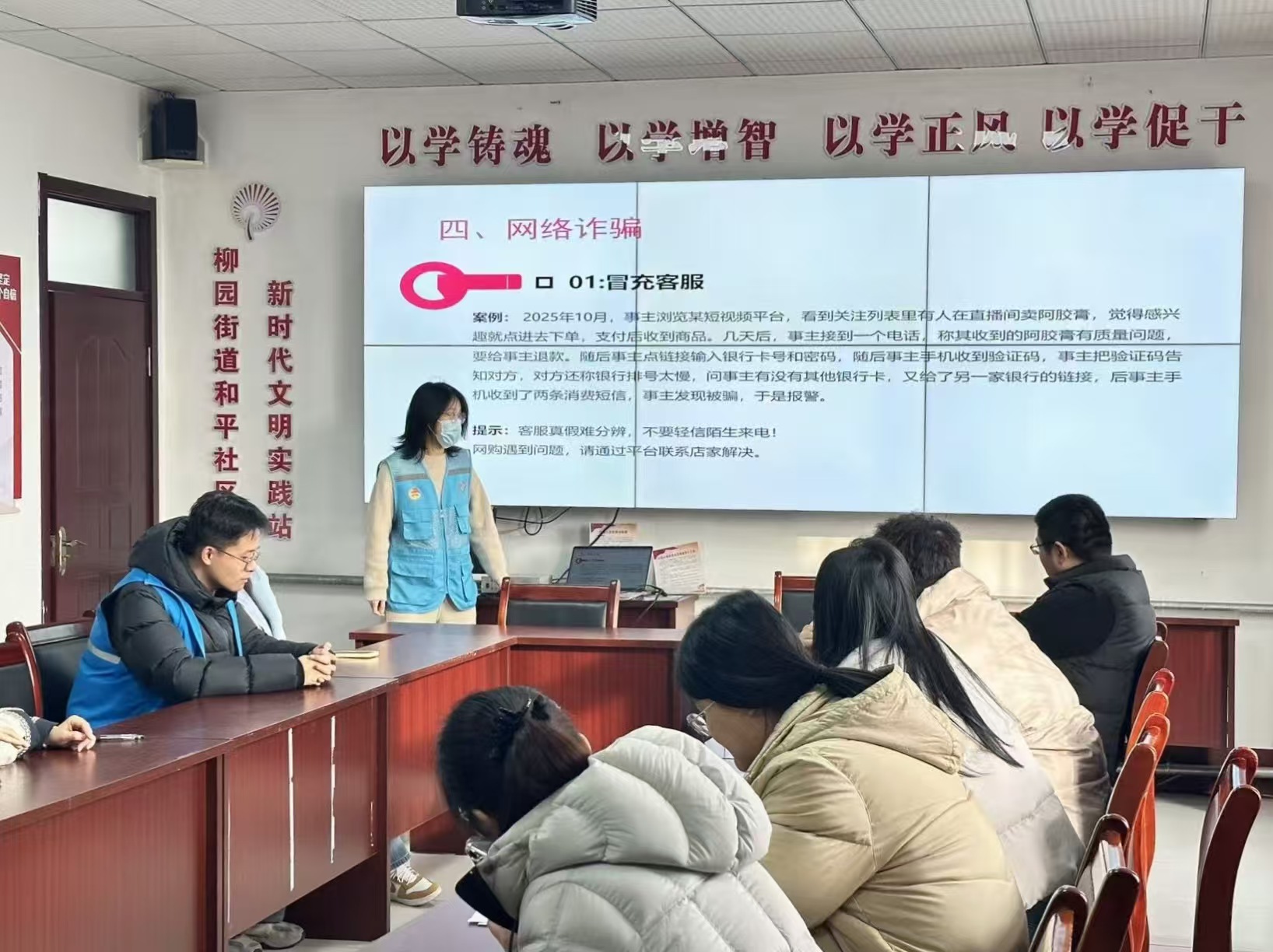 2月5日上午,聊城大学马克思主义学院暖阳助老服务队深入聊城市东昌府区柳园街道和平社区党群服务中心,面向社区老年群体举办了一场题为“筑牢防诈安全网,平安喜乐迎新春”的专题知识宣讲活动。此次活动旨在提升老年人防范各类电信网络诈骗的意识和能力,守护好老年人的“钱袋子”,让他们度过一个安心、祥和的新春佳节。