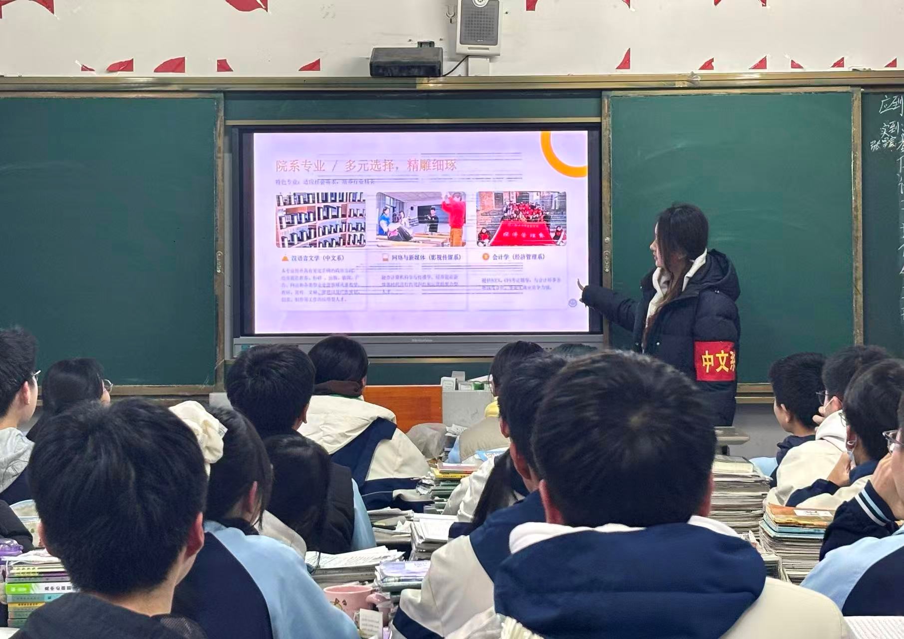 活动期间,志愿者分赴各地高中母校,开展招生宣讲、学习经验分享会等系列活动。宣讲中,志愿者们以多种形式介绍我校深厚底蕴、师资力量、完善的办学条件及丰硕的教学成果。同时,志愿者们结合自身在我校的学习成长经历,向高中学弟学妹讲述专业学习乐趣、校园文化特色与学校育人成果,分享高考备考、专业选择、大学生活规划等实用经验,生动传递了学校“崇德尚学、求是致用”的精神内核。