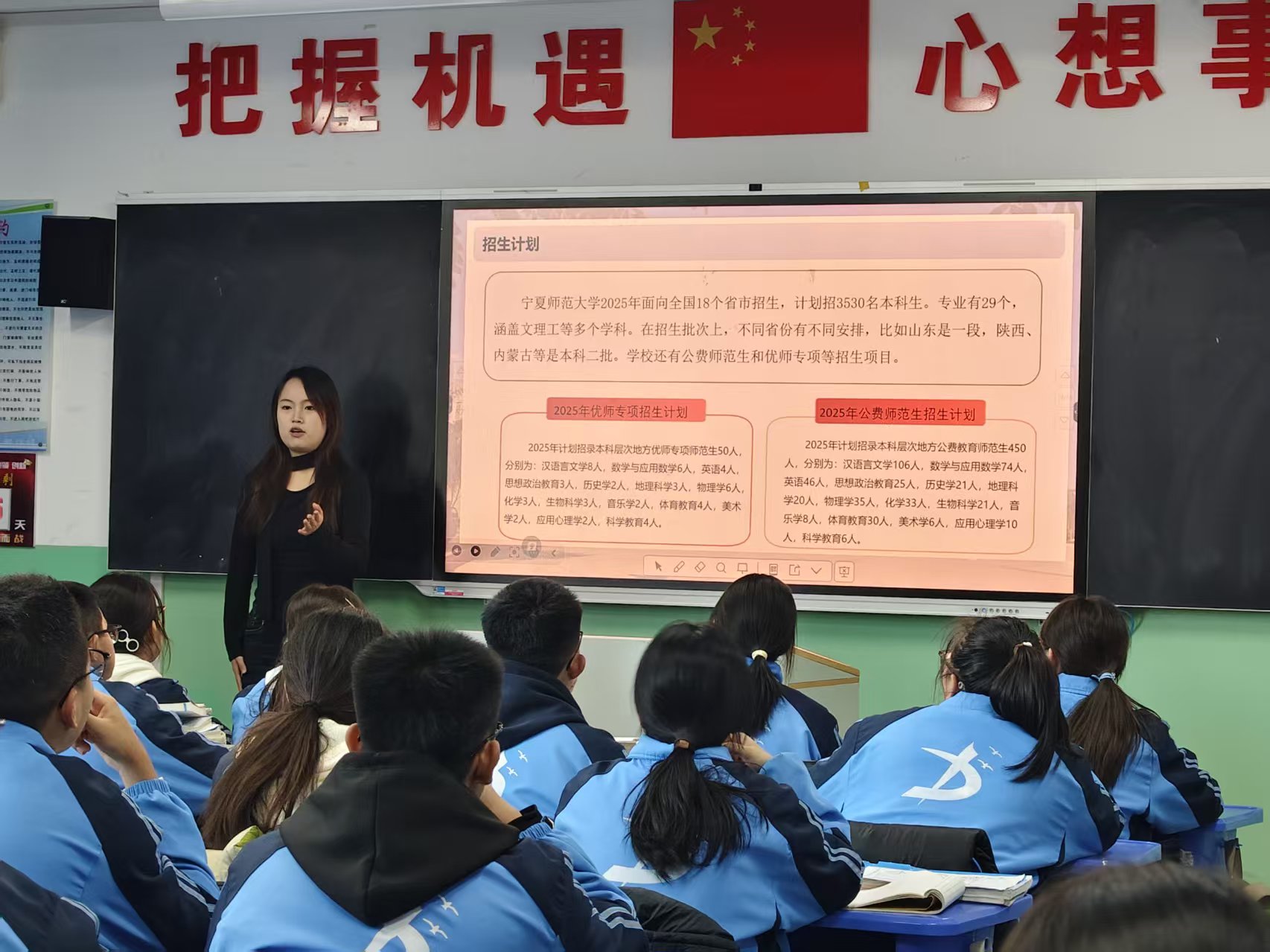 宣讲过程中,实践队深入班级、走进学生,采取“互动交流+案例分享”的形式,打破传统宣讲模式,让宁师故事更温暖、更生动。队员们通过播放学校宣传片,直观呈现宁夏师范大学的办学底蕴、校园风貌、教学设施及育人成果;结合自身在校学习、科研实践与校园生活经历,分专业开展特色宣讲—从地理科学专业的野外调研实践到化学工程与工艺专业的学科优势及就业前景;从学前教育专业“理论+技能+实践”的一体化培养模式,到舞蹈表演专业的多元发展路径……鲜活的事例与真切的感悟,使学子们对宁师的专业设置与人才培养有了更全面、更深刻的认识。现场互动积极、反响热烈,有效激发了同学们报考宁夏师范大学的兴趣与热情。学长学姐的亲切视角增强了宣传的真实性与感染力,引发学子们强烈共鸣。
