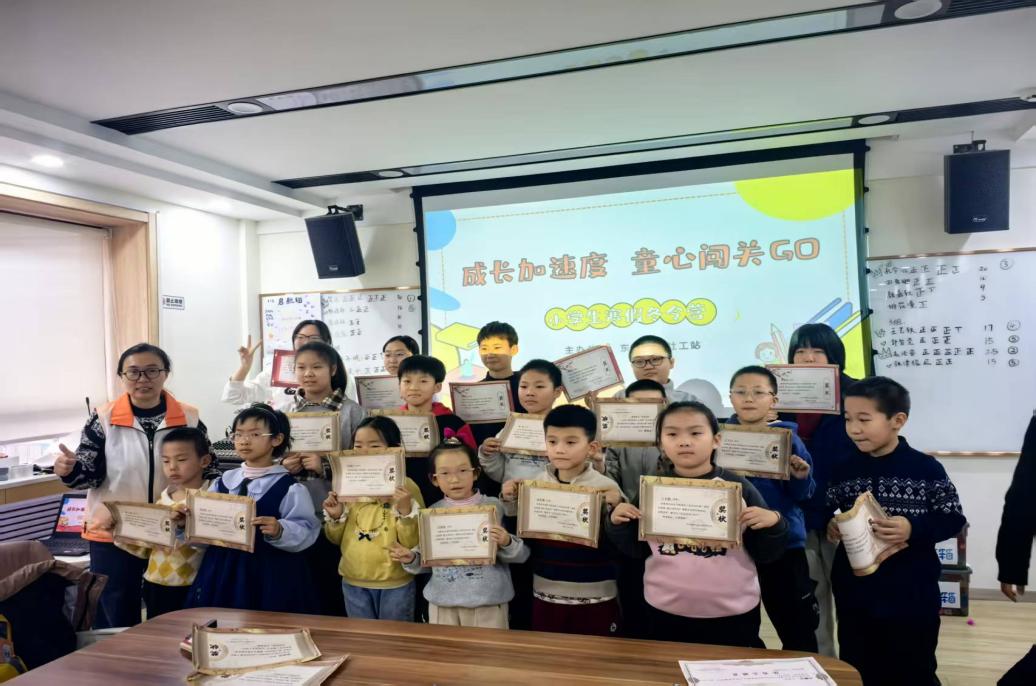 课业辅导结束后,本次“小候鸟课堂”冬令营闭营仪式正式拉开帷幕。仪式上,志愿者老师带领孩子们一同回顾了冬令营的精彩瞬间,非遗糖画的动手实践、电学科普课的趣味实验、英语课堂的兴趣启蒙、软笔书法课的认真创作……一幕幕画面唤起了孩子们的共同回忆,也让大家细数着这段时间的成长与收获。为了肯定孩子们在冬令营中的积极表现与点滴进步,现场为每位孩子颁发了精心准备的奖品,一张张笑脸在掌声中愈发灿烂。