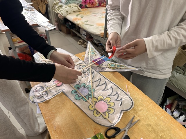 绘画完成后,同学们进入风筝骨架搭建环节。大家小心翼翼地拼接、粘合木条,反复调整角度、纠正骨架弧度,全神贯注地固定风筝根基,在相互帮忙、彼此探讨中,将耐心与细心融入每一道工序,为风筝成型筑牢基础。从生疏摸索到熟练配合,从零散材料到一只只形态各异、独具巧思的风筝渐渐成型,同学们在忙碌的指尖间收获了满满的成就感,欢声笑语萦绕现场。