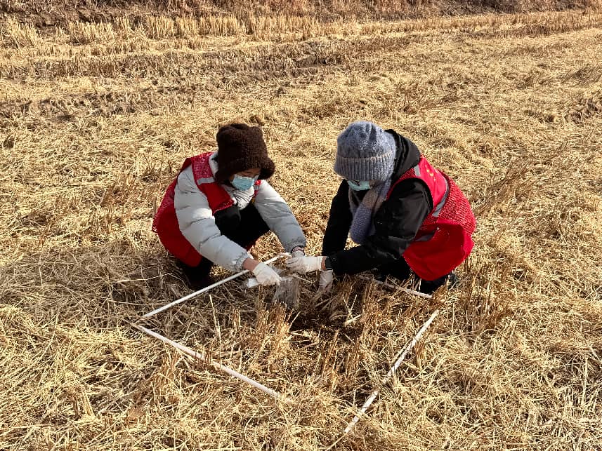 团队经过实践的学习与复盘,以黄河三角洲核心农田为调研靶区,在垦利区、河口区同步开展系统性调查。按1km×1km划分栅格,剔除无农田区域后,按作物类型分层随机抽样,采用“五点取样法”布设1m×1m样方,精准开展鸟粪计数、鲜干状态记录与拍照存档,同步标注作物类型、生长阶段及至道路、河流距离等关键信息。针对鸟粪量极少的栅格,及时增加样方补充采集,避免数据偏差;黄河两岸小组保持调查标准统一,结合当地农田分布特点即时微调抽样方案,确保两地数据的可比性与科学性,为后续分析提供坚