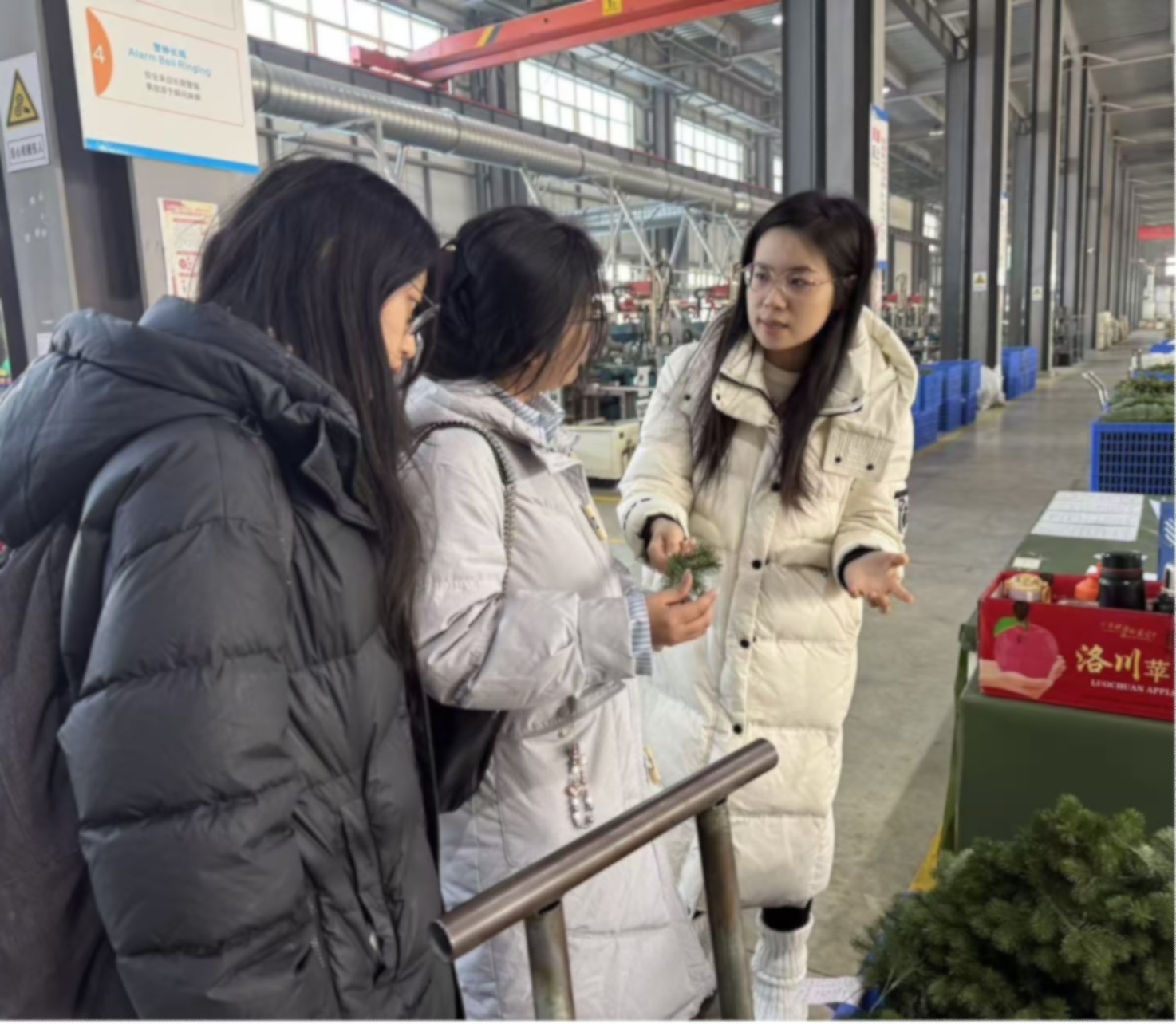 图4 实践团成员参观龙星集团 图5 圣诞树展示区域 1月13日,实践团探访上合组织经贸合作阵地:上午走进上合生活馆·跨境商品体验中心,了解商品跨境采购、物流及运营;下午前往上合农业国际贸易港,观摩园区建设与物流枢纽,体会数智技术对跨境贸易的赋能。