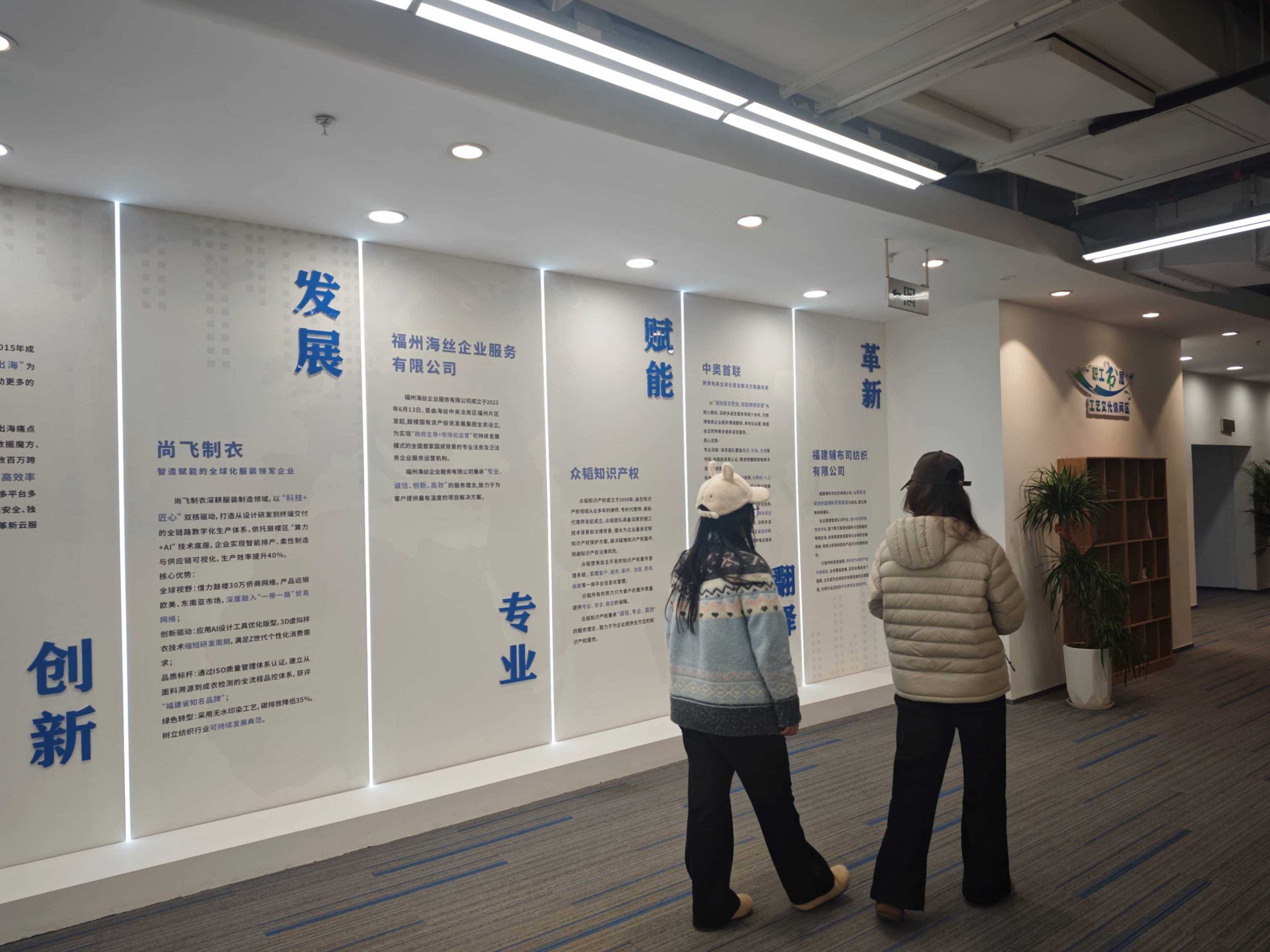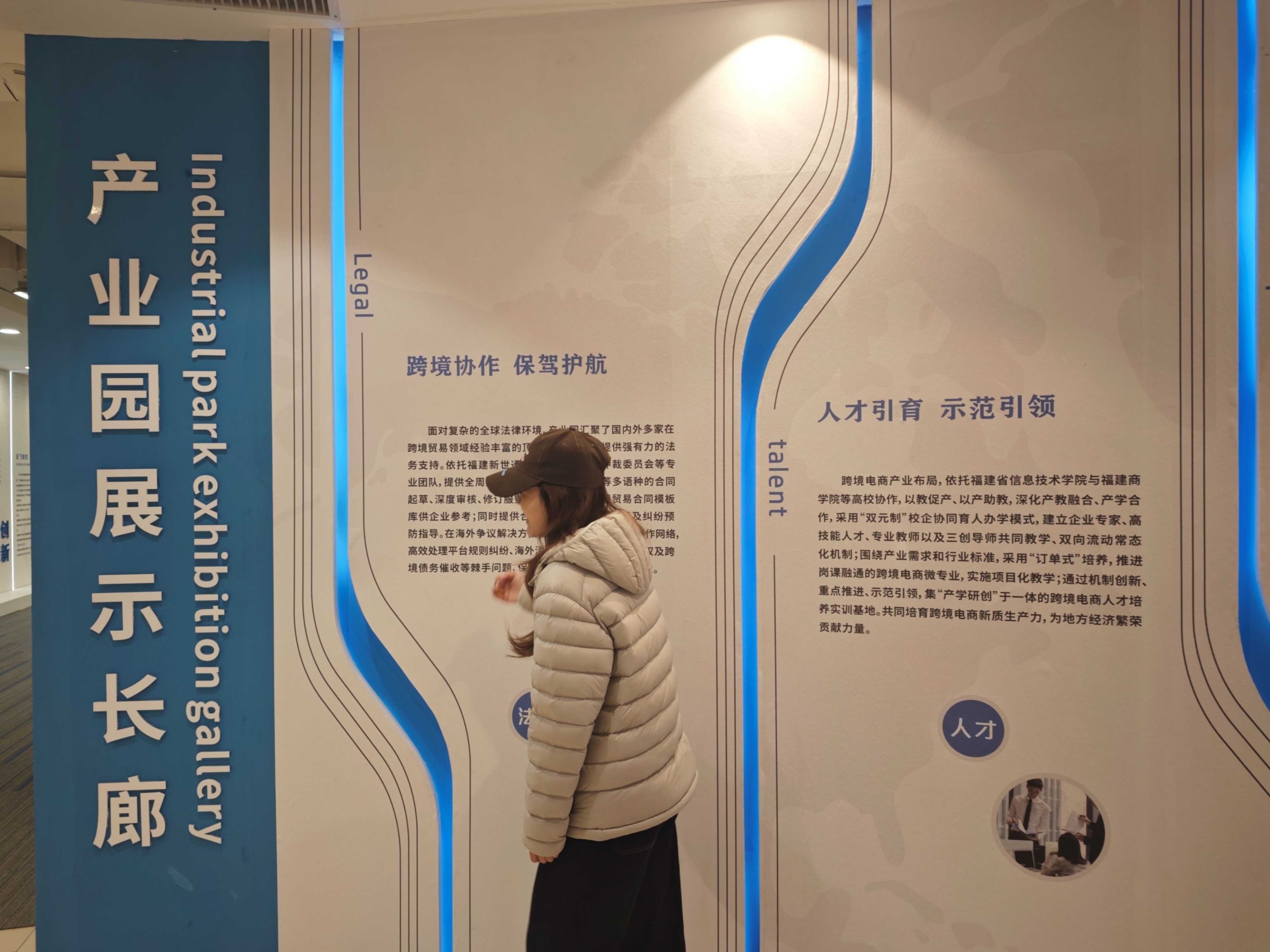 图10 实践团成员参观数字化服务展厅(AI选品与合规法务模块) 1月15日,实践团走进福州跨境电商产教融合实训基地。该基地采用“双元制”校企协同育人模式,是“产学研创”一体的人才培育平台,为跨境电商产业输送复合型人才。
