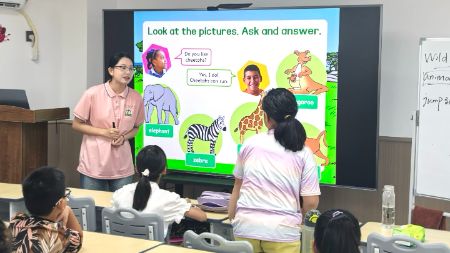 在英语绘本课堂上,实践队队员遵循“听故事、看画面、玩游戏、开口说”四维学习模式,结合PPT,激发孩子的听觉、视觉与语言表达潜能。以趣味小游戏为线,引导学生大胆表达所想、所感。孩子们从最初的青涩不敢开口,到沉浸于生动的故事场景与趣味互动中,在沉浸式体验中建立英语思维。不仅让孩子们摆脱机械背诵的压力,还提高了孩子们英语口语表达能力。