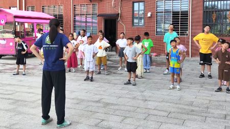图为志愿者带领孩子们做热身运动。林雨涛摄