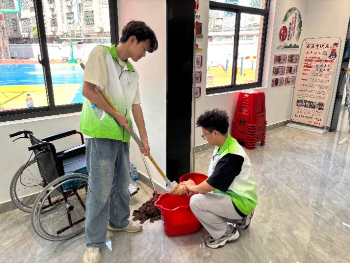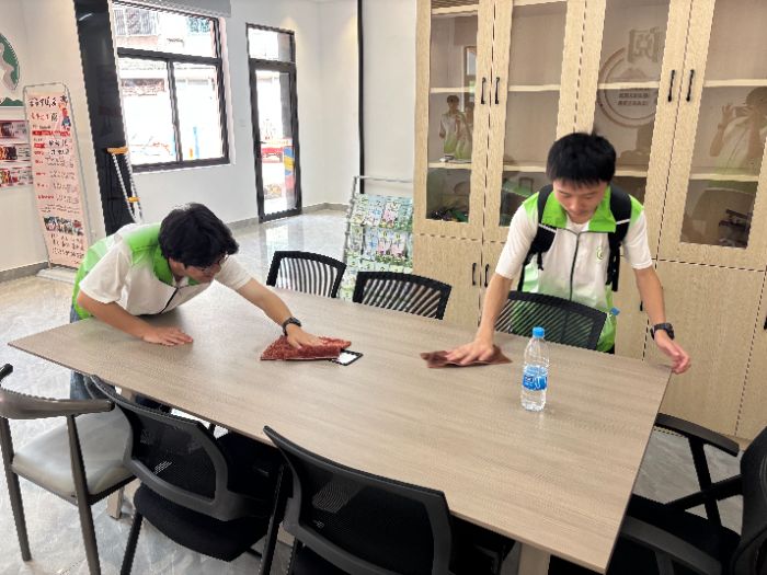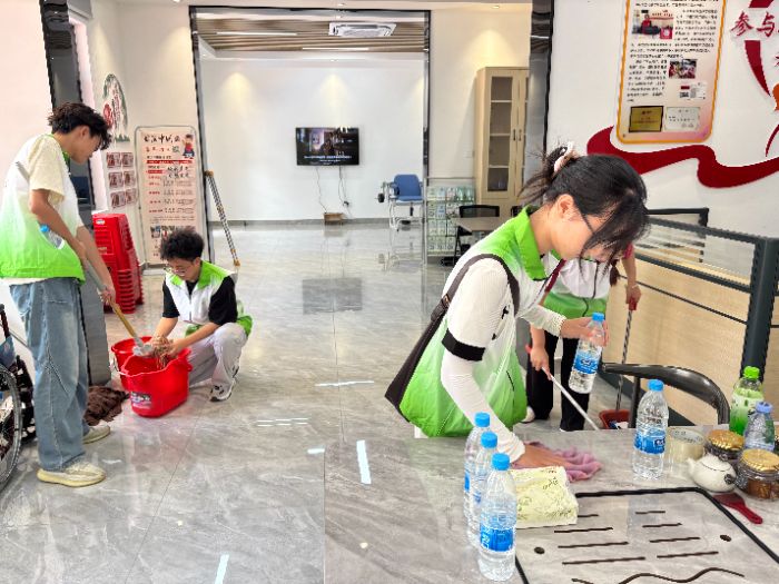 活动尾声,团队主动开展服务站义务清扫。队员们分组擦拭桌椅、整理器材、清扫死角,在劳动中深入了解服务站功能分区与残障群体生活环境。