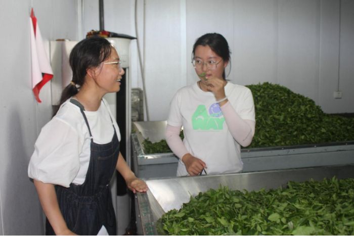 图为实践队员观察茶叶晾晒情况。王晶 供图