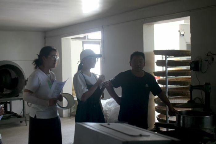 图为实践队员在茶厂老板的带领下参观茶厂、了解炒茶过程。袁成鑫 供图