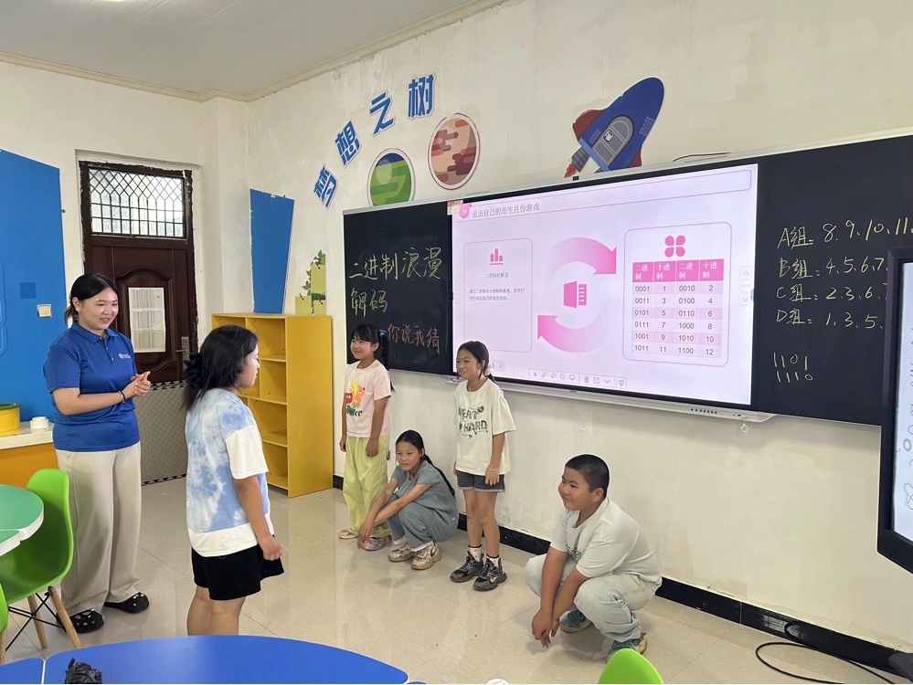 团队结合专业特色,设计了“二进制浪漫解码”“AI梦想家”等趣味课程,带领30余名乡村孩子探索编程与AI的奇妙世界。孩子们化身“小程序员”,成功完成Scratch游戏任务,在欢声笑语中点燃了科技梦想同时,团队成员还为学生们展示了“水中烟花”“泡泡龙”“彩虹雨”“水果电池”等近15个富有趣味性的科学小实验和科学理论宣讲课程,并且联系实际,用浅显易懂的方式帮助学生们了解和掌握实验背后蕴含的力学、AI等科学知识。不仅如此,活动还融入思政教育,通过爱国主义课堂和“人工智能时代”主题课程,厚植学生们的家国情怀。