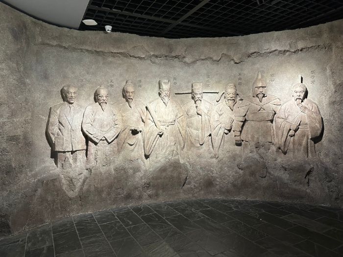 登上二楼,志愿者进入“六朝京畿”和“人杰地灵”展区。“六朝京畿”展区以墓葬文物和陶器演变为主题,展示马鞍山在六朝时期的独特地位,这些文物无声地诉说着社会变迁。“人杰地灵”展区则以石雕形式呈现了苏里、夏燮、邢珣等历史名人。这些人物或以文治武功彪炳史册,或以高风亮节流传后世,他们的事迹与马鞍山的山水文化紧密相连。志愿者在石雕前驻足,深受其坚韧与奉献精神的感染。这些品质与革命精神中的顽强拼搏、不畏牺牲高度契合,激发了志愿者的深刻共鸣。