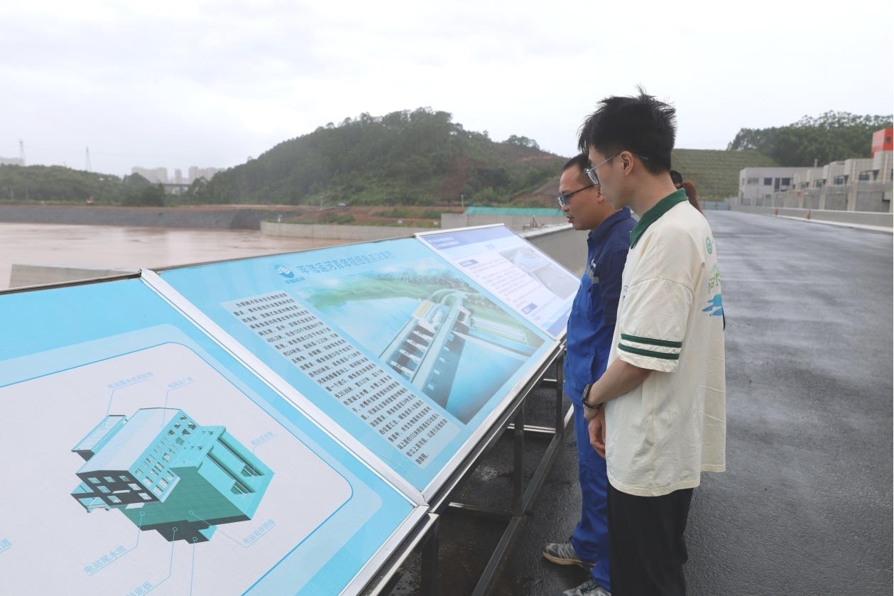 实践团首先通过现场展板系统了解了国家高等级航道网布局规划。平陆运河作为国家航道网“四纵”体系的重要组成部分,是推动西南地区对外开放的先导工程。“从规划之初,‘生态优先’就贯穿始终。”工作人员介绍,青年枢纽在设计中融入了鱼道建设、水土保持等生态措施,目前正同步推进主体工程与环境监测设施建设,为后续运行期生态管控奠定基础。团队成员认真记录枢纽的工程规模、生态配套措施及当前建设进度,不仅为后续专业研讨积累基础信息,更对“重大工程与生态保护协同推进”有了直观认知。