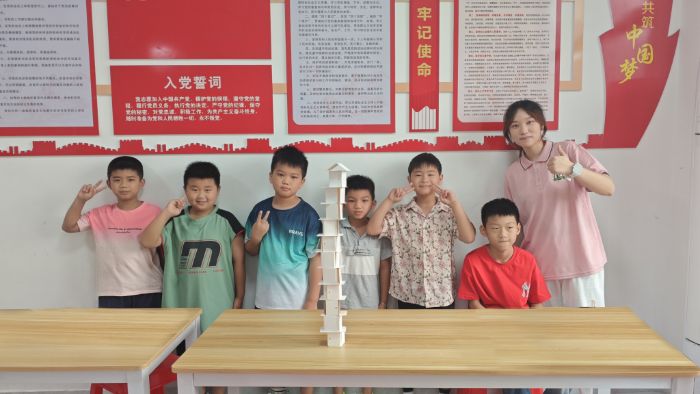 孩子们迅速分组投入挑战。起初,有的小组急于求成,高塔屡屡倒塌;有的小组则稳扎稳打,尝试不同底座结构。志愿者在旁巡视,适时提示调整底座形状等搭建思路。过程中,即便高塔中途倒塌,孩子们也能快速重整,继续尝试。